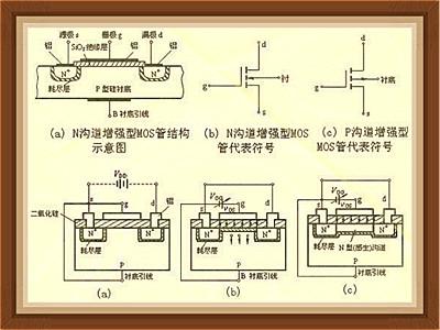 在一塊摻雜濃度較低的P型硅襯底上,制造兩個高摻雜濃度的N+區,并用金屬鋁引出兩個電極,別離作漏極d和源極s。然后在半導體外表掩蓋一層很薄的二氧化硅(SiO2)絕緣層,在漏——源極間的絕緣層上再裝上一個鋁電極,作為柵極g。在襯底上也引出一個電極B,這就構成了一個N溝道增強型MOS管。MOS管的源極和襯底通常是接在一同的(大多數管子在出廠前已聯接好)。它的柵極與其它電極間是絕緣的。圖(a)、(b)別離是它的構造示意圖和代表符號。代表符號中的箭頭方向標明由P(襯底)指向N(溝道)。P溝道增強型MOS管的箭頭方向與上述相反,如圖(c)所示。