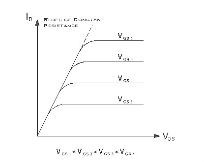 在這個(gè)區(qū)域內(nèi),UDS增加時(shí),ID線性增加。在導(dǎo)電溝道接近夾斷時(shí),增長(zhǎng)變緩。在低UDS分開夾斷電壓較大時(shí),MOS管相當(dāng)于一個(gè)電阻,此電阻隨著UGS的增大而減小。截止區(qū)(UGS
