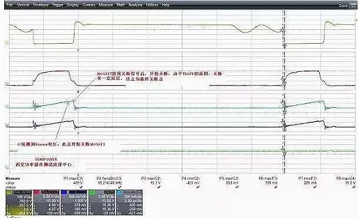 從圖中能夠看出,電流波形在快到電流尖峰時,有個下跌,這個下跌點后又有一段的上升時間,這段時間其實質就是IC在檢測到過流信號執(zhí)行關斷后,MOSFET自身也開端執(zhí)行關斷,但是由于器件自身的關斷延遲,因而電流會有個二次上升平臺,假如二次上升平臺過大,那么在變壓器余量設計缺乏時,就極有可能產生磁飽和的一個電流沖擊或者電流超器件規(guī)格的一個失效。