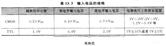 表13.3列出邏輯器件最典型的輸入電壓的規(guī)格。電源電壓為5V的電子設(shè)備中,要按CMOS電平或者TTL電平停止設(shè)計(jì)。為什么存在兩種規(guī)格?這是由于CMOS與雙極的電路構(gòu)造不同。世界上首先降生的邏輯器件是TTL。TTL長期作為邏輯電路的主流被運(yùn)用著。后來的CMOS在開展過程中逐步樹立起CMOS本人的規(guī)格設(shè)定,這是歷史緣由構(gòu)成的。