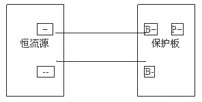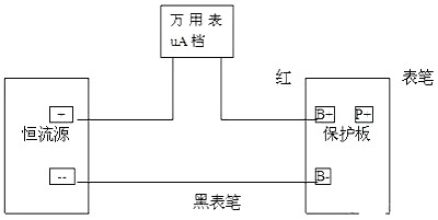 調恒流源為3.7V/500mA;萬用表設置為uA檔,表筆插入uA接孔,然后與恒流源串聯起來接保護板B+、B-如下圖所示:此時萬用表的讀數即為保護板的自耗電,如無讀數用鑷子或錫線短接B-、P-,激活電路。