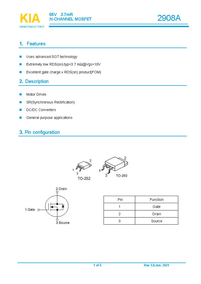 參數: ID(A): 130/110 BVDSS(V): 85 RDS(ON): 3.7mΩ Qg(nC): 77 Package: TO-252.TO-263