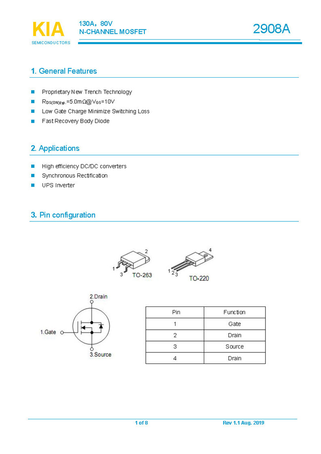 參數: ID(A): 130    BVDSS(V): 80    RDS(ON): 5.0mΩ    Qg(nC): 100    Package: TO-220.263