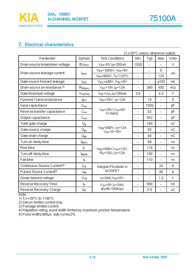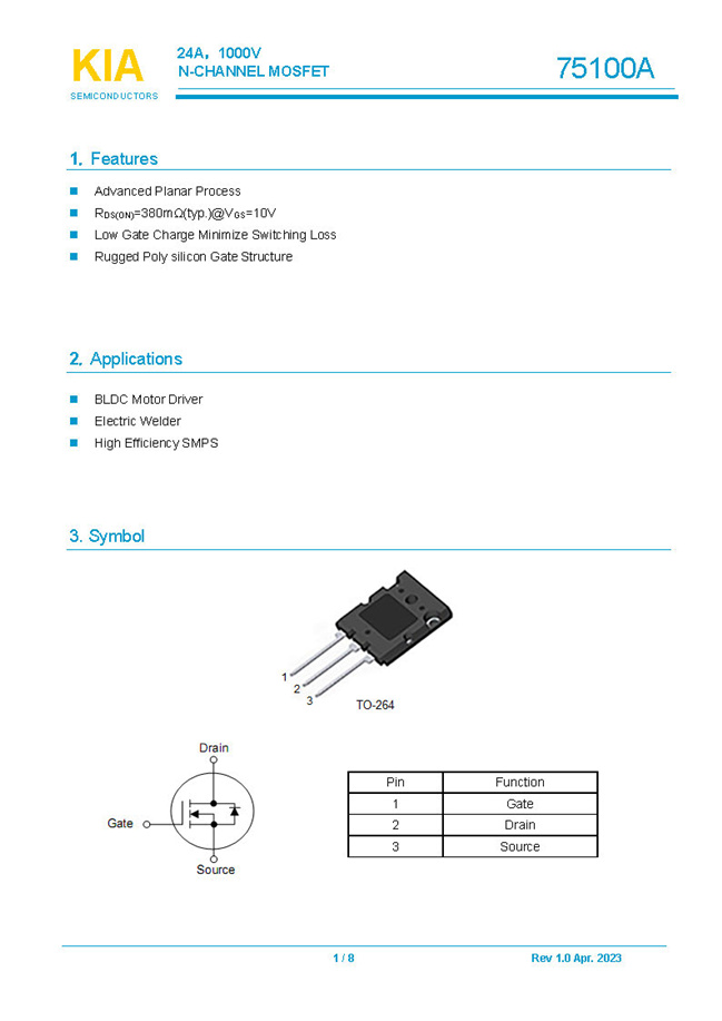 參數: ID(A): 24 BVDSS(V): 1000 RDS(ON): 380mΩ Qg(nC): 180 Package: TO-264
