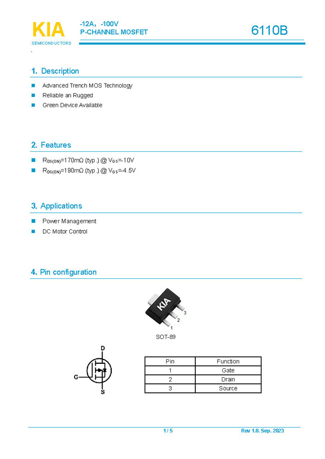 參數(shù): ID(A): -12 BVDSS(V): -100 RDS(ON): 170mΩ Qg(nC): 19 Package: SOT-89