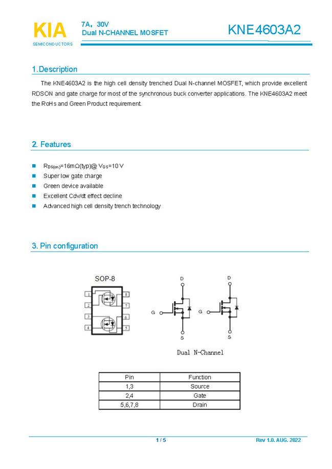 參數: ID(A): 7 BVDSS(V): 30 RDS(ON): 16mΩ Qg(nC): 4.9 Package: SOP-8