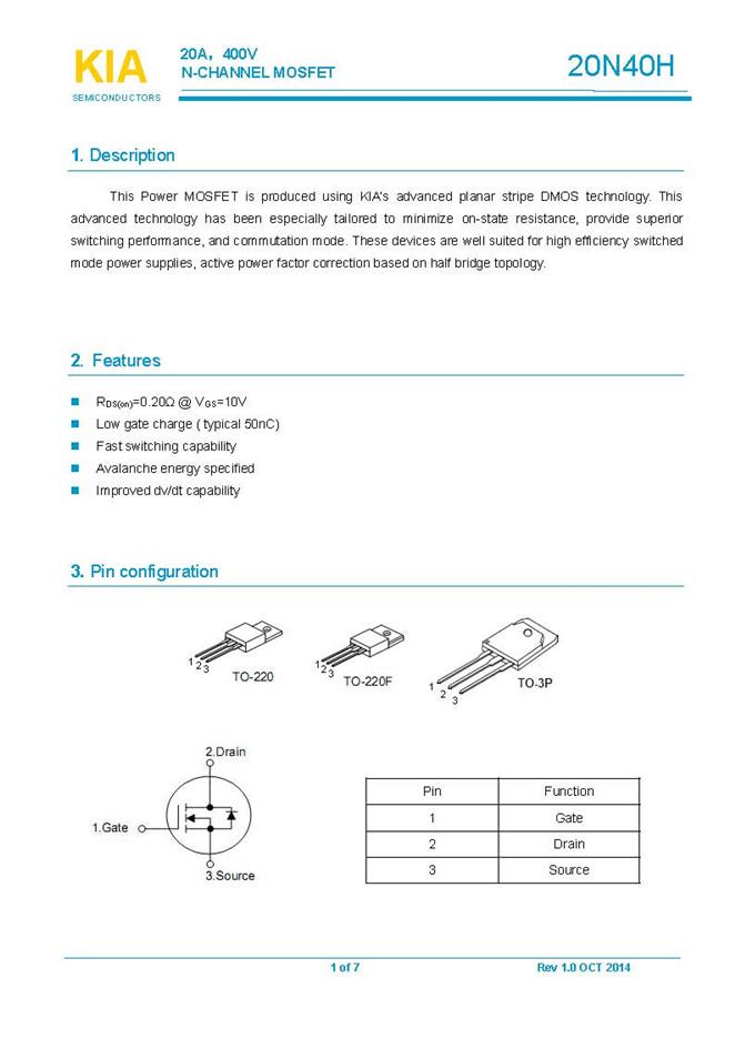 參數: ID(A): 20    BVDSS(V): 400    RDS(ON): 0.25    Qg(nC): 50    Package: TO-220、TO-220F、TO-3P